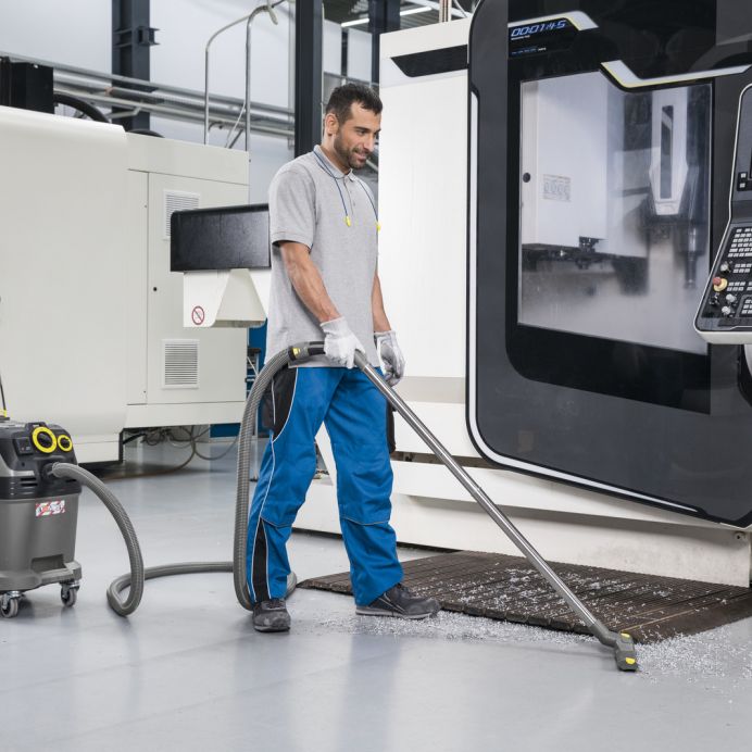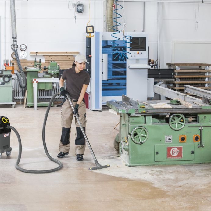 Aspiratorul umed-uscat NT 40/1 Tact Te este pentru oricine apreciază în aceeași măsură un volum mare al recipientului cât și gradul ridicat de mobilitate. Recipientul solid de 40 litri, potrivit pentru toate tipurile de murdărie, de la fină până la cea grosieră, atât solide cât și lichide este dotat cu protecție și roți metalice. Intervalele de lucru lungi sunt posibile oricând. La acest fapt contribuie și sistemul deosebit de curățare al filtrului Tact și filtrul plat pliat PES. Noul comutator pentru reglarea permanentă a vitezei și priza automată integrată asigură comoditate în operare. Dotări suplimentare: dimensiuni compacte pentru a fi mai ușor de manevrat și transportat, mâner ergonomic de împingere. Indiferent de locul de utilizare: hale de producție, ateliere sau în construcții, toți utilizatorii vor beneficia de gama noua și extinsă a accesoriilor ce pot fi depozitate în siguranță pe aparat.