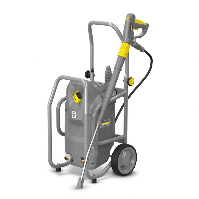 Aparat de curățat cu înaltă presiune foarte robust, neîncălzit HD 8/18-4 M Cage cu cadru tubular din oțel acoperit cu pulberi de vopsea pentru utilizare comercială în condiții grele și protecție maximă a unității de pompare.
