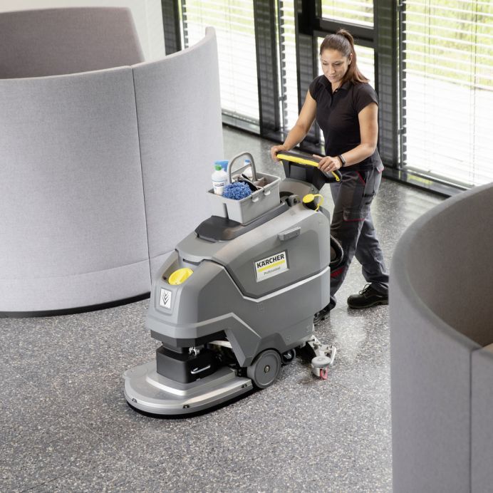 Masina de frecat aspirat cu baterie BD 50/55 W Classic Bp, permite aplicații de curățare îndelungate și fără oboseală datorită tracțiunii sale integrate și sistemului confortabil cu patru roți. Un cap de perie cu disc fabricat din aluminiu de înaltă calitate, racleta curbată de 850 milimetri, precum și presiunea periei de 27 kg, asigură rezultate excelente de curățare. Mașina robustă impresionează, de asemenea, prin conceptul său de operare foarte simplu și ușurința în utilizare.