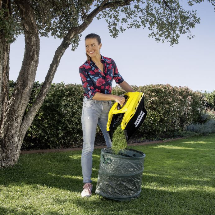 - Recipientul de colectare din material textil poate fi pliat devenind foarte mic și ocupă foarte puțin spațiu atunci când este depozitat pe mașina de tuns iarba.