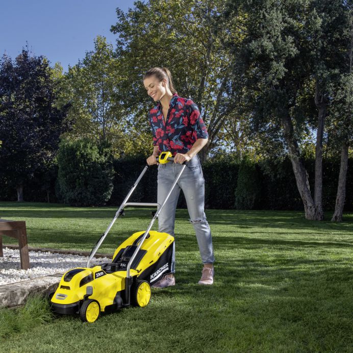 Pentru manevrarea fără efort în grădină: Mașina de tuns iarbă ușoară și extrem de manevrabilă LMO 18-33 Battery Set, include bateria și încărcătorul rapid.