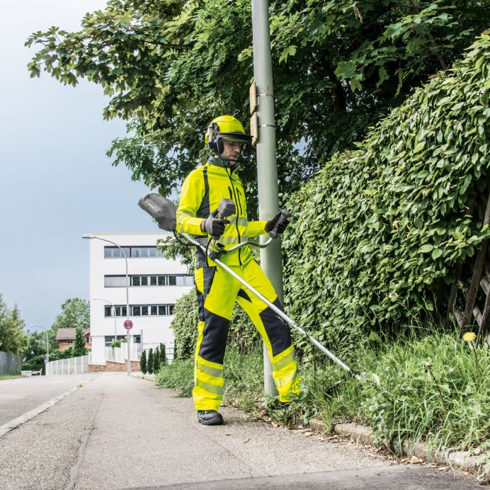 Pentru toate zonele care sunt greu de accesat pentru vehiculele municipale Kärcher în timpul utilizării zilnice, cum ar fi în jurul băncilor din parc, marginile bordurilor sau marcajelor rutiere, am dezvoltat trimmer-ul ST 400 Bp alimentat cu acumulatori pentru a completa alte produse și pentru a veni în sprijinul utilizatorului. Acest dispozitiv puternic, ușor impresionează, de asemenea, ca o alternativă la trimmer-ele alimentate cu benzină în activitățile de eradicare a buruienilor și a ierburilor sălbatice pe suprafețe mai mari sau pe suprafețe înclinate. Datorită zgomotului redus de funcționare, spre deosebire de omologii săi cu motoare alimentate cu benzină, acesta poate fi utilizat și în zone sensibile la zgomot, cum ar fi în zonele rezidențiale, în apropierea școlilor, grădinițelor și spitalelor, precum și în timpul activităților desfășurate seara. Are o autonomie mare și este puternic mulțumită bateriei inovatoare litiu-ion de 50 V. De asemenea, funcționează cu emisii zero, protejând atât utilizatorul, cât și mediul înconjurător. Pe lângă toate acestea, utilizatorul beneficiază de un nivel redus de vibrații și de mânerul ergonomic reglabil, ținut cu două mâini, ceea ce îi permite utilizatorului să lucreze pe perioade lungi de timp fără a obosi. Te rugăm să selectezi acumulatorul corespunzător cerințelor tale și încărcătorul corespunzător pentru acumulator.