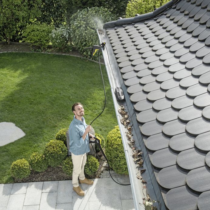 Solutie de sistem 2 in 1 pentru o curatare cu inalta presiune a jgheaburilor si tevilor rapida si usoara, fara scara. Cu furtun de inalta presiune de 20m.