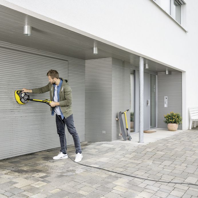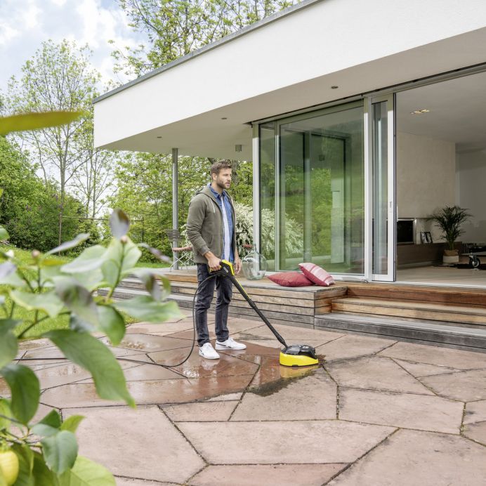 Cu ajutorul dispozitivului T-Racer T 7 Plus, suprafețele mari din exterior pot fi curățate eficient și fără stropirea utilizatorului. Brațul rotativ Twin Jet asigură îndepărtarea murdăriei de pe suprafete mari, ceea ce economisește aproximativ 50% din timpul de lucru în comparație cu lancea de pulverizare. Duza de presiune suplimentară permite de asemenea curățarea eficientă a colțurilor și a marginilor. Și cu ajutorul duzei de clătire, murdăria dizolvată poate fi clătită ușor de pe suprafața curățată. Prin reglarea distanței duzei fata de suprafata de curățare, pot fi curățate atât suprafețele dure, cum ar fi piatra și betonul, cât și suprafețele mai sensibile, cum ar fi lemnul. Diferitele funcții pot fi controlate convenabil prin apăsarea lor cu piciorul. Chiar și suprafețele verticale, cum ar fi ușile garajului, pot fi curățate în timp util datorită mânerului practic. Compatibil cu aparatele de spalat cu presiune din clasele K 4 - K 7.